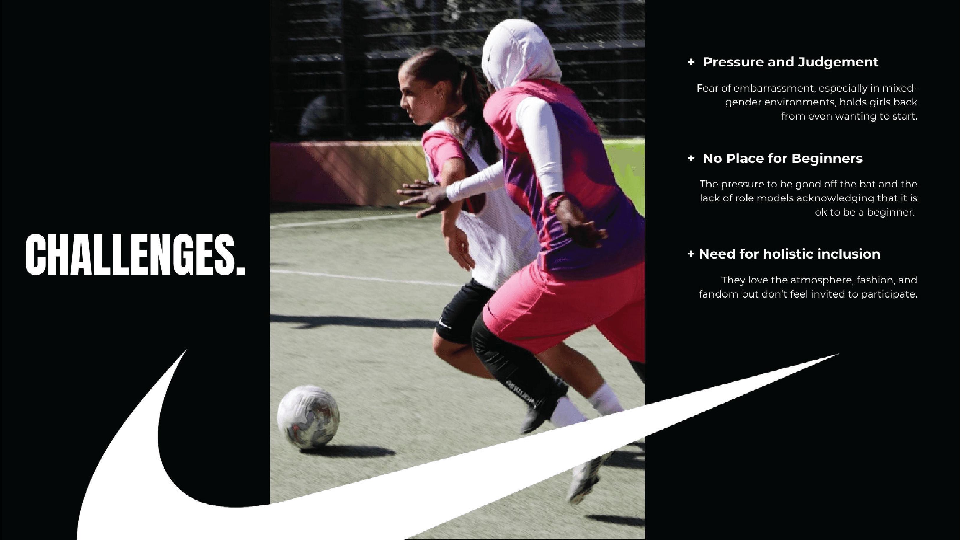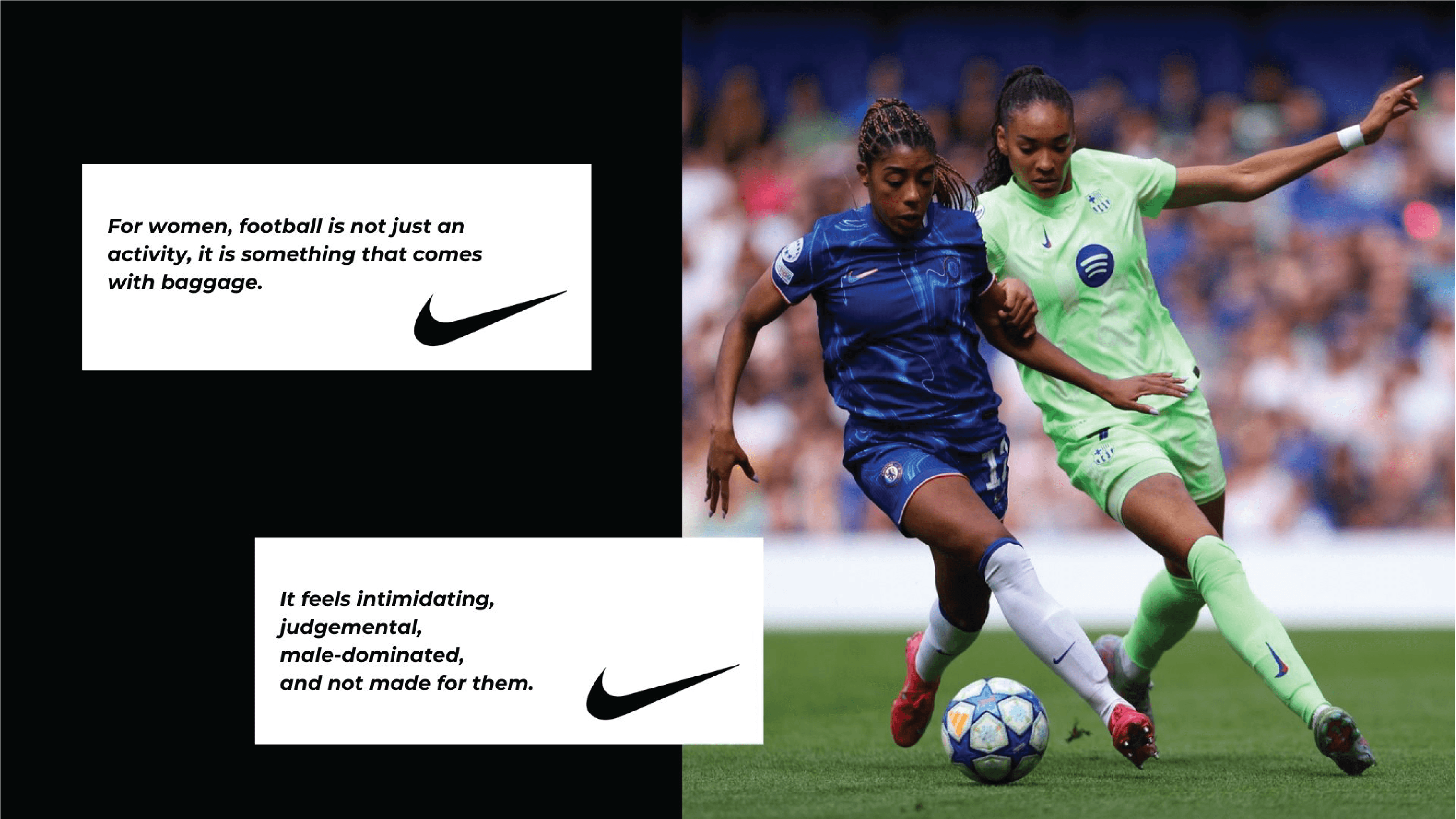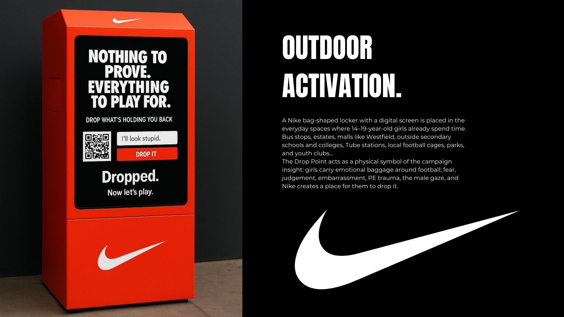 Modular lockers placed in local pitches where girls can literally lock away their "baggage" (anxieties) and swap them for playing gear. Finally a QR-led flow in the Nike App to find local beginner-only sessions.